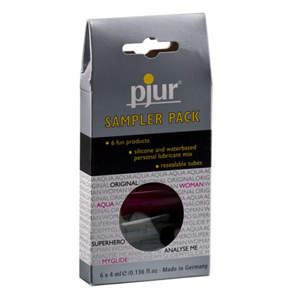 W komplecie znajdują się bestsellerowe środki nawilżające firmy pjur: Original, Woman, Aqua, Superhero, Analyse Me, MyGlyde.