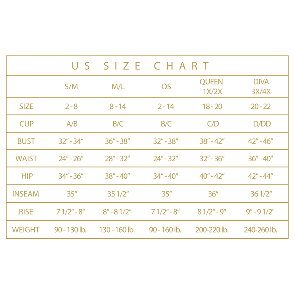 Rozmiar uniwersalny S/M/L, One Size, w tabeli rozmiarów widoczny jako OS lub L/XL. Queen Size, w tabeli rozmiarów widoczny jako Queen.