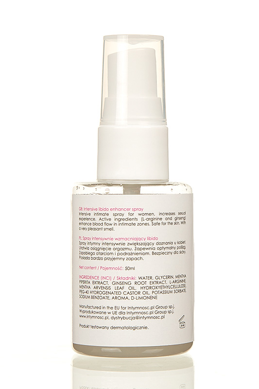 LibiSpray to wyjątkowy preparat o działaniu silnie pobudzającym i rozgrzewającym. Spryskaj nim wargi sromowe i łechtaczkę, a odczujesz niesamowite uczucie mrowienia, które wprawi Cię w natychmiastowe podniecenie i uwrażliwi łechtaczkę na dotyk. LibiSpraydzięki właściwościom energetyzującym doda Ci energii i sprawi, że będziesz czuć się piękniejsza i pewniejsza swojej seksualności.