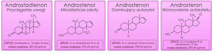 • Androsteron To najbardziej kobiecy ze wszystkich składników. Wywołuje efekt dominacji, ale nie wpływa na efekt agresji, stwarzając raczej aurę bezpieczeństwa. Naturalnie ujawnia się u spokojnych samic, typu Alpha.