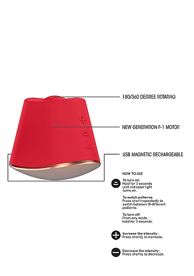 Ta elegancka zabawka posiada 2 silniki F1 nowej generacji, które obracają się nawet do 7500 obr./ min. oferuje 10 unikalnych trybów wibracji. DAZZLING oferuje obrót zgodnie z ruchem wskazówek zegarka lub w przeciwną stronę (180/360 stopni), gwarantując stymulację pod każdym kątem i dostarczając orgazmów. DAZZLING posiada certyfikat CE, wykonany jest w 100% z gładkiego silikonu medycznego, jest wodoodporny (IP67) i niesamowicie cichy (poniżej 60 dB). Posiada akumulator, który po ponownym naładowaniu za pomocą przewodu USB zapewni pełne 60 minut cudownej zabawy.