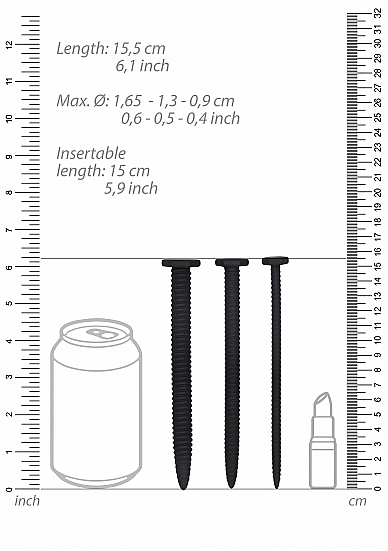 OUCH! Wprowadza nową linię zabawek dla odkrywców pragnących stymulacji cewki moczowej! Jeśli sondowanie cewki moczowej Cię kręci, pozwól aby te gładkie urządzenia dostarczyły Ci nieziemską przyjemność!" W cewce moczowej znajdują się niezwykle wrażliwe zakończenia nerwowe, które gwarantują niesamowitą przyjemność podczas stymulacji. Ponadto głębokie sondowanie cewki moczowej to jedyny sposób na bezpośredni masaż prostaty. OUCH! Oferuje różnorodne sondy do cewki moczowej, które zadowolą zarówno początkujących jak i starych wyjadaczy. Ten zestaw 3 gwoździ" ma zaokrąglone końcówki ułatwiające wprowadzanie. Zaokrąglona spłaszczona główka umożliwia łatwe i szybkie wyjęcie urządzenia. Wykonane z super delikatnego silikonu medycznego bez ftalanów gwoździe mają długość wynoszącą 15,5 cm, można wprowadzić je na głębokość do 15 cm i posiadają trzy różne średnice: 0,9 cm, 1,3 cm i 1,65 cm. Używaj zawsze z pomocą sterylnego lubrykantu na bazie wody i wprowadzaj przyrząd powoli, stopniowo intensyfikując doznania