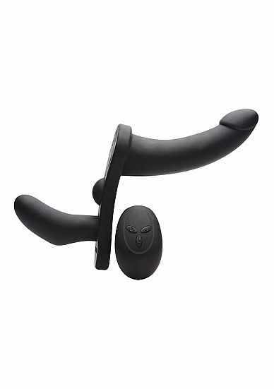 Od teraz ogranicza Cię już tylko Twoja wyobraźnia! Dwustronne dildo na uprzęży od firmy XR zostało zaprojektowane tak abyście oboje - w tym samym czasie - odczuwali przyjemność ze zdalnie sterowanych wibracji! Poznaj 3 prędkości i 7 trybów pulsacyjnych generowanych przez dwa osobne silniki - po jednym dla każdego z Was. Przełóż dłuższe dildo przez otwór w minimalistycznej uprzęży, natomiast krótsze, zakrzywione dildo umieść w pochwie i doświadcz intensywnej stymulacji Punktu G. Nieduża, okrągła wypukłość umiejscowiona tuż przed mniejszym dildo ma za zadanie ocierać się o Twoją łechtaczkę dodatkowo ją stymulując. Dłuższe dildo - przeznaczone dla Twojego partnera jest lekko wygięte dla jak najintensywniejszego podrażniania zakończeń nerwowych w Punkcie G lub Punkcie P. Pilot zdalnego sterowania ułatwia przechodzenie między 10 ustawieniami bez konieczności przerywania penetracji.Uwodzicielska uprząż posiada 2 punkty regulacji zapewniające idealne dopasowanie. Dwustronne dildo jest wykonane z najwyższej jakości silikonu bez ftalanów, dzięki czemu jest idealnie gładkie i całkowicie bezpieczne dla Twojego ciała. Produkt nie jest kompatybilny z lubrykantami silikonowymi. Ten bezprzewodowy, erotyczny gadżet z możliwością ładowania jest również całkowicie wodoodporny. Po użyciu dokładnie wyczyść przy pomocy łagodnego mydła i ciepłej wody lub środka do czyszczenia zabawek erotycznych.
