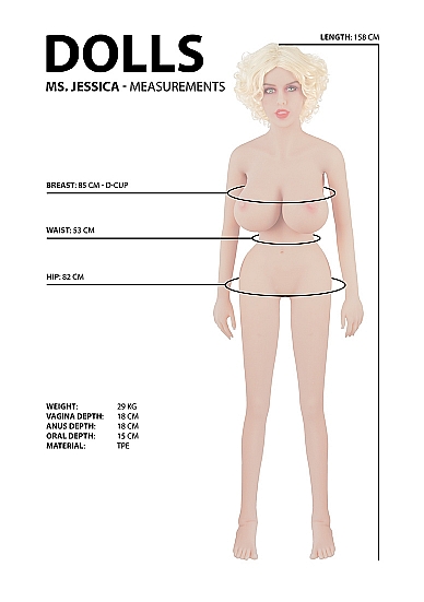 Stojąca lalka wykonana z bezpiecznego dla ciała materiału TPE. Miękka w dotyku, imitująca ludzką skórę. Jessica ma trzy otwory gotowe na niesamowitą zabawę erotyczną, która spełni wszystkie Twoje pragnienia. Obszary pochwy, odbytu i jamy ustnej są gotowe na seks. Jessica należy czyścić po każdym użyciu, aby uniknąć gromadzenia się bakterii. Należy używać lubrykantu tylko na bazie wody, lubrykanty na bazie silikonu lub ropy naftowej mogą uszkodzić skórę Jessica.