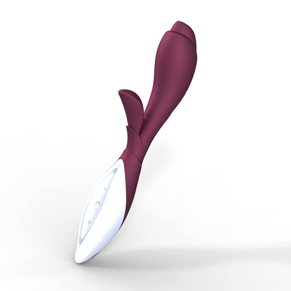 Wyraźne, rozkoszne fale wibracjibiegną od zakrzywionego czubka po wygięty stymulator łechtaczki.