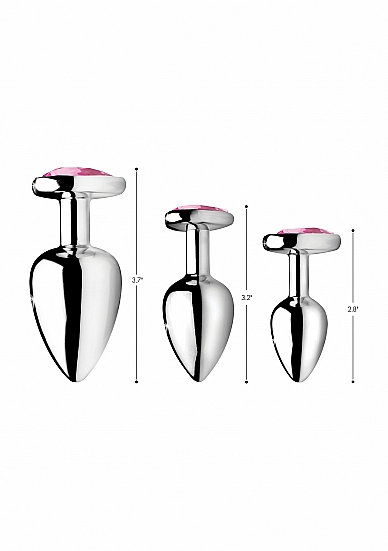 Czujesz jak miłość unosi się w powietrzu? Zaskocz partnera ozdabiając swoje ciało! Korki analne w kształcie serca są jednocześnie słodkie i seksowne. Trzy różne rozmiary pozwalają na stopniowe dochodzenie do największego lub pozostanie przy jednym, ulubionym. Poszerzaj swoje seksualne horyzonty! Wsuń w siebie elegancki korek analny i delektuj się przyjemnym rozpieraniem oraz zmysłowym obciążeniem. Dzięki zastosowaniu bezniklowego stopu aluminium korki świetnie nadają się do zabaw termicznych - można je ogrzać lub ochłodzić w wodzie przed aplikacją. Błyszczący, różowy klejnot u podstawy będzie romantyczną i ekscytującą niespodzianką dla Twojego partnera, gdy zdejmiesz bieliznę i pochylisz się przed nim. Używaj z dowolnym lubrykantem, a po użyciu wyczyść łagodnym mydłem i ciepłą wodą lub środkiem do dezynfekcji zabawek erotycznych.
