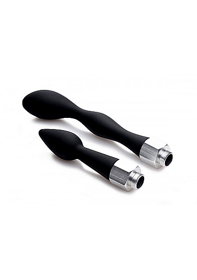 Wykonane z najwyższej jakości silikonu dysze z nasadkami zapewniają wyjątkowe wrażenia podczas lewatywy. Obie dysze o optymalnych długościach i kształtach posiadają w podstawie mocowanie do węża systemu lewatywy. Mniejsza dysza zwęża się ku górze, dzięki czemu można ją łatwo wsunąć do końca i zapewnić wygodną penetrację. Duża dysza ma zakrzywioną główkę, aby precyzyjnie ukierunkować przyjemność, ma również dłuższy trzonek do głębokiego oczyszczania. Obie nasadki są gładkie, trwałe i komfortowe w użytkowaniu pod prysznicem. Niekompatybilny z lubrykantem silikonowym.